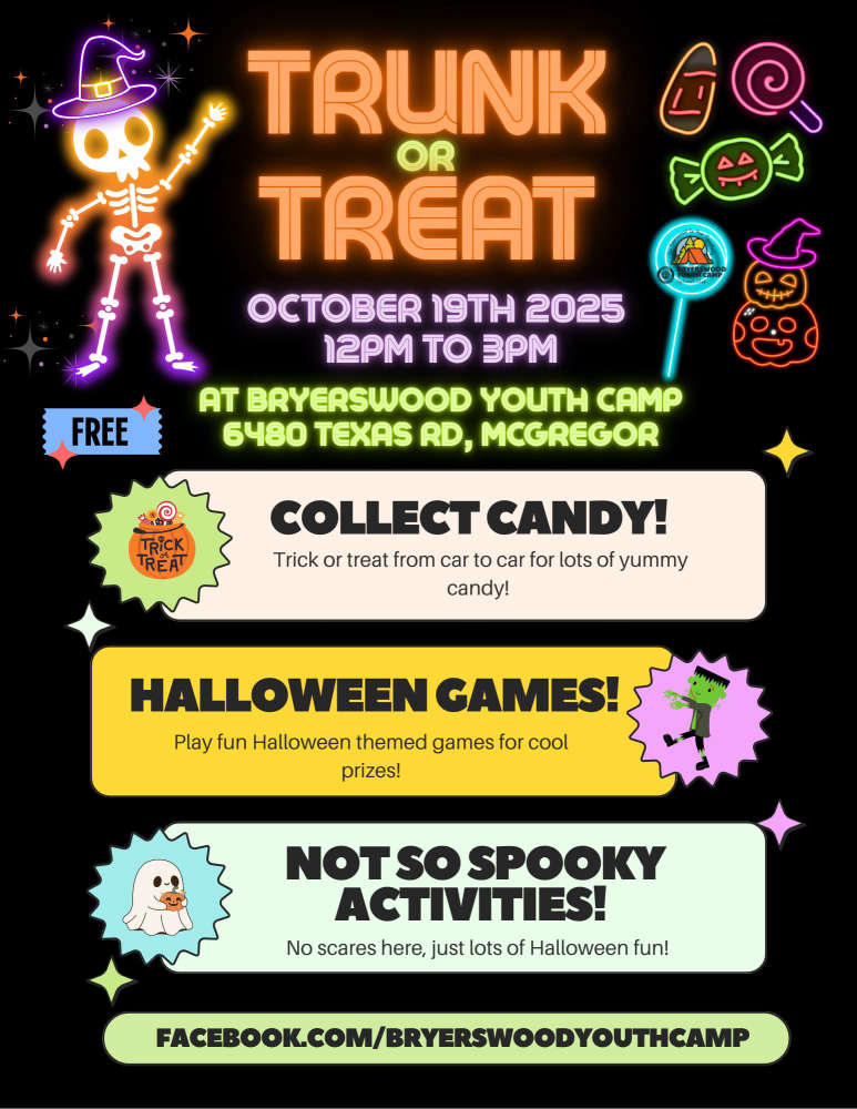 On October 19th, 2025 from 12:00pm-3:00pm check out Bryerswood Youth Camp's Trunk or Treat. More details on the flyer below.